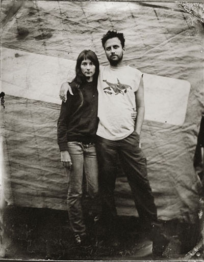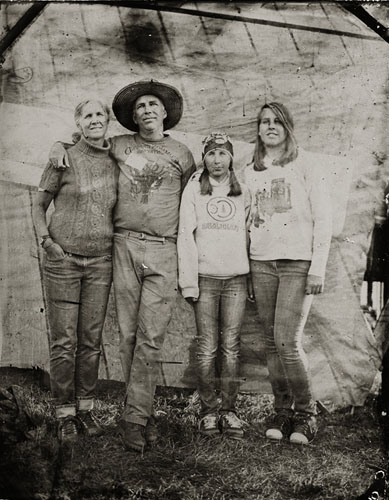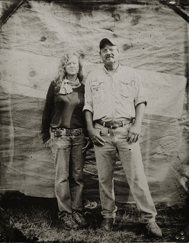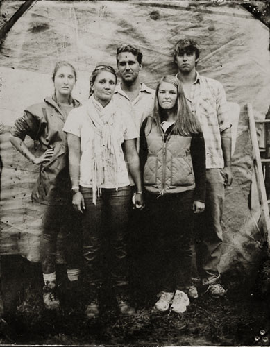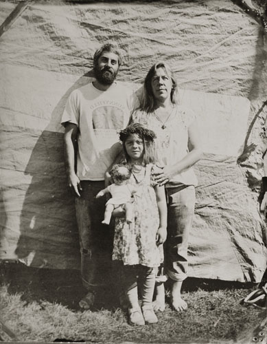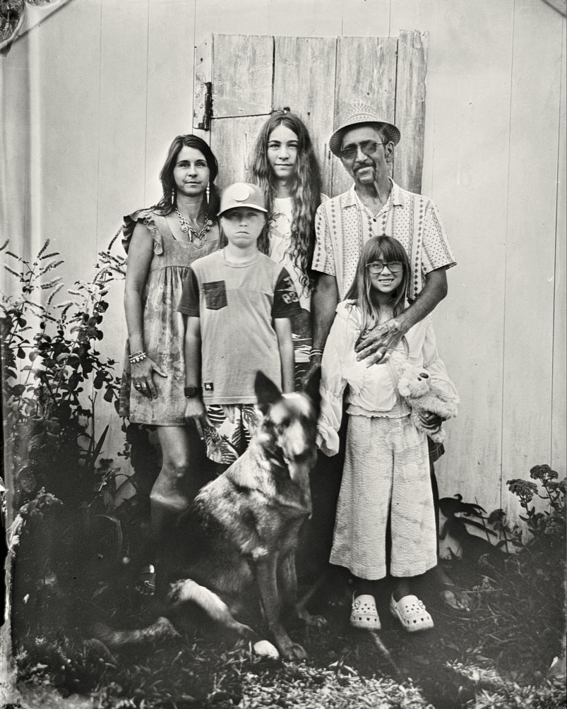 Cole Caswell has been shooting natural light Tintype commissions for the past decade. Working outside within the world allows for a dynamic photographic moment. Natural light tintypes can be made in a range of sizes 4×5, 5×7, and 8×10. Each size can accommodate any number of people. Exposures hover around one second and require the sitter to hold still momentarily while the exposure is made. This slow exposure allows aspects of the world to creep in as the wind blows a dress hem, a dog moves his muzzle, or a baby twists in a mothers grasp. Natural light is what was used in the 19th century to create tintype portraits.