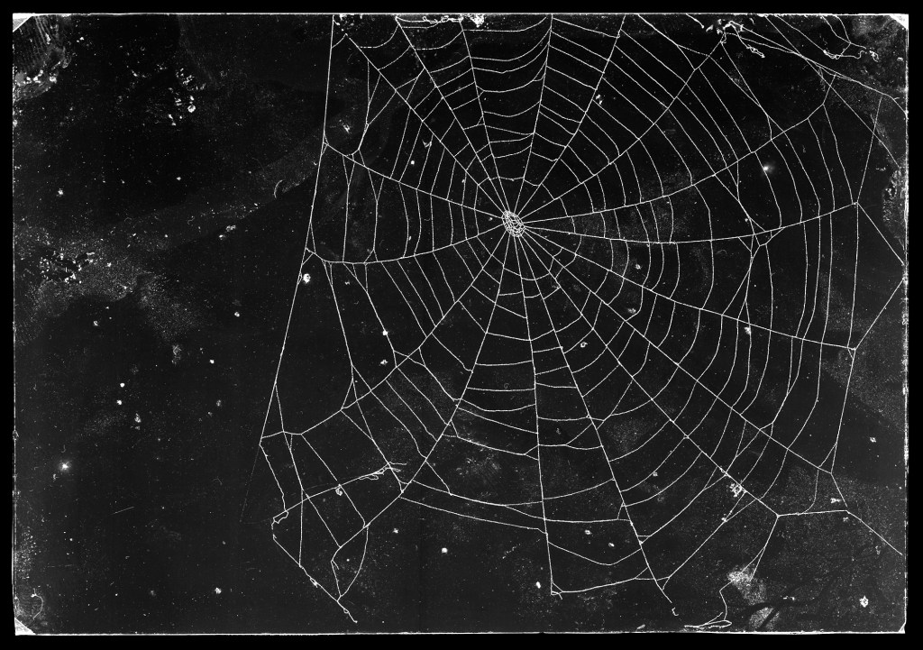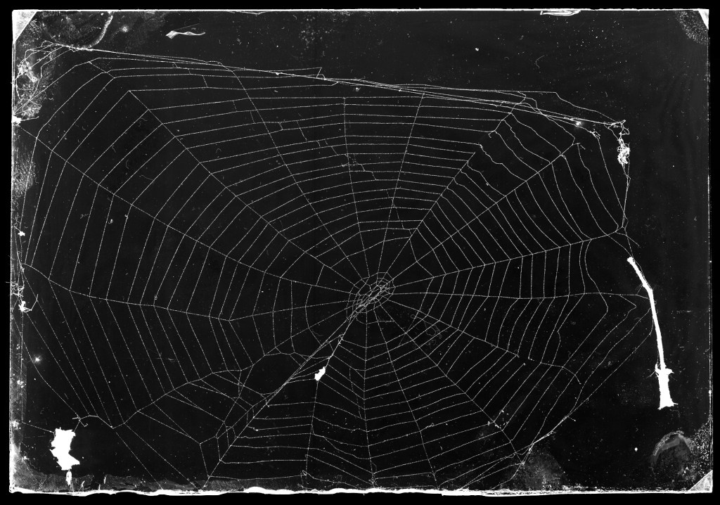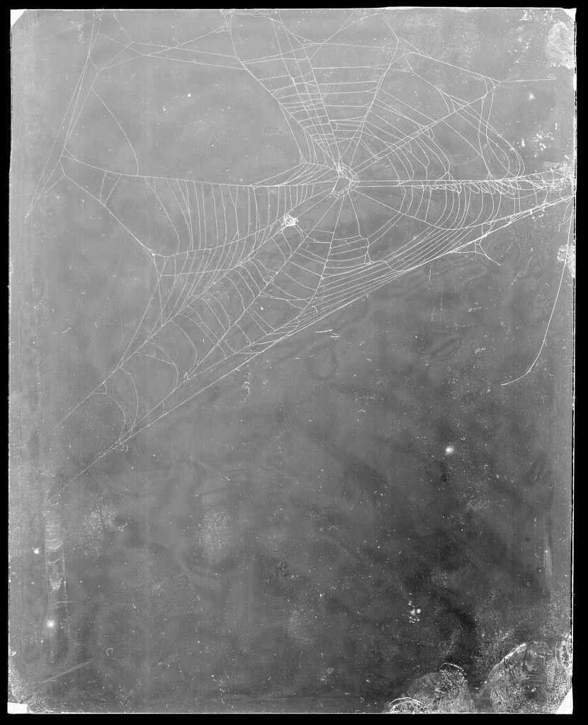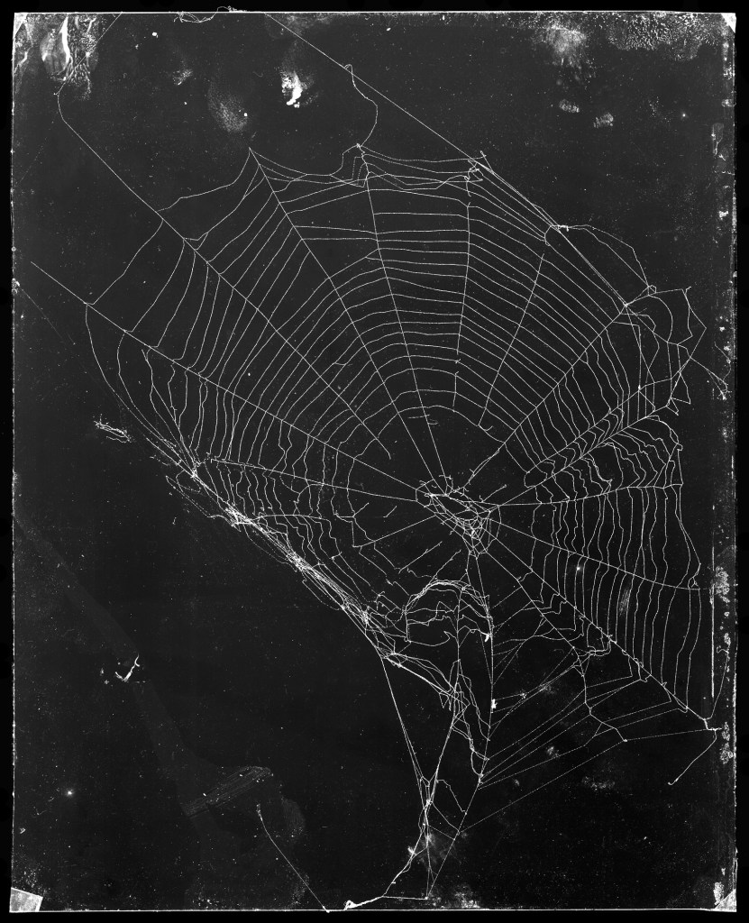 Survival Lines is a visual exploration using the historic photographic process of wet-plate collodion to collect and explore the webs of spiders. The works are created when the web is directly collected onto a prepared glass plate from the landscape surrounding my studio in Maine. I see these works as a combination of scientific specimens, explorations of form, and metaphors related to the human world webs we need to survive. The underlying interconnectedness of our contemporary world drives my questions and investigations into these works.